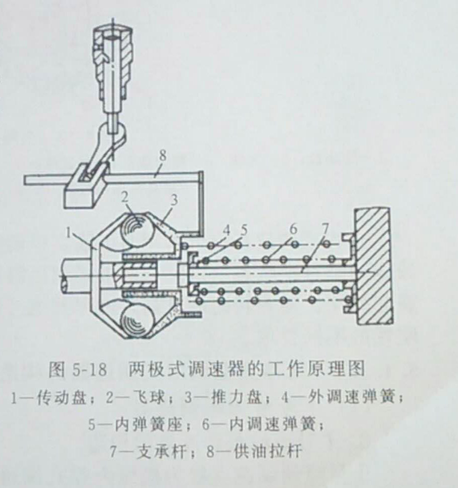 這時,由于內(nèi)彈簧預(yù)緊力大而剛性強,因此即使轉(zhuǎn)速繼續(xù)升高,飛球的離心力仍不足以推動內(nèi)彈簧座移動。但此時如由于外界負(fù)荷變化使轉(zhuǎn)速低于n時,外調(diào)速彈簧即可推動供油拉桿左移增加供油量,以保持發(fā)電機組可在nd轉(zhuǎn)速下穩(wěn)定工作。nd即為低空轉(zhuǎn)轉(zhuǎn)速。當(dāng)發(fā)電機組轉(zhuǎn)速升至標(biāo)定轉(zhuǎn)速時,飛球離心力顯著升高,其軸向分力與內(nèi)、外彈簧彈力相平衡。如果這時轉(zhuǎn)速稍許上升,推力盤即推壓內(nèi)、外彈簧,使供油量減少,其工作情況與前述單程式調(diào)速器相同。